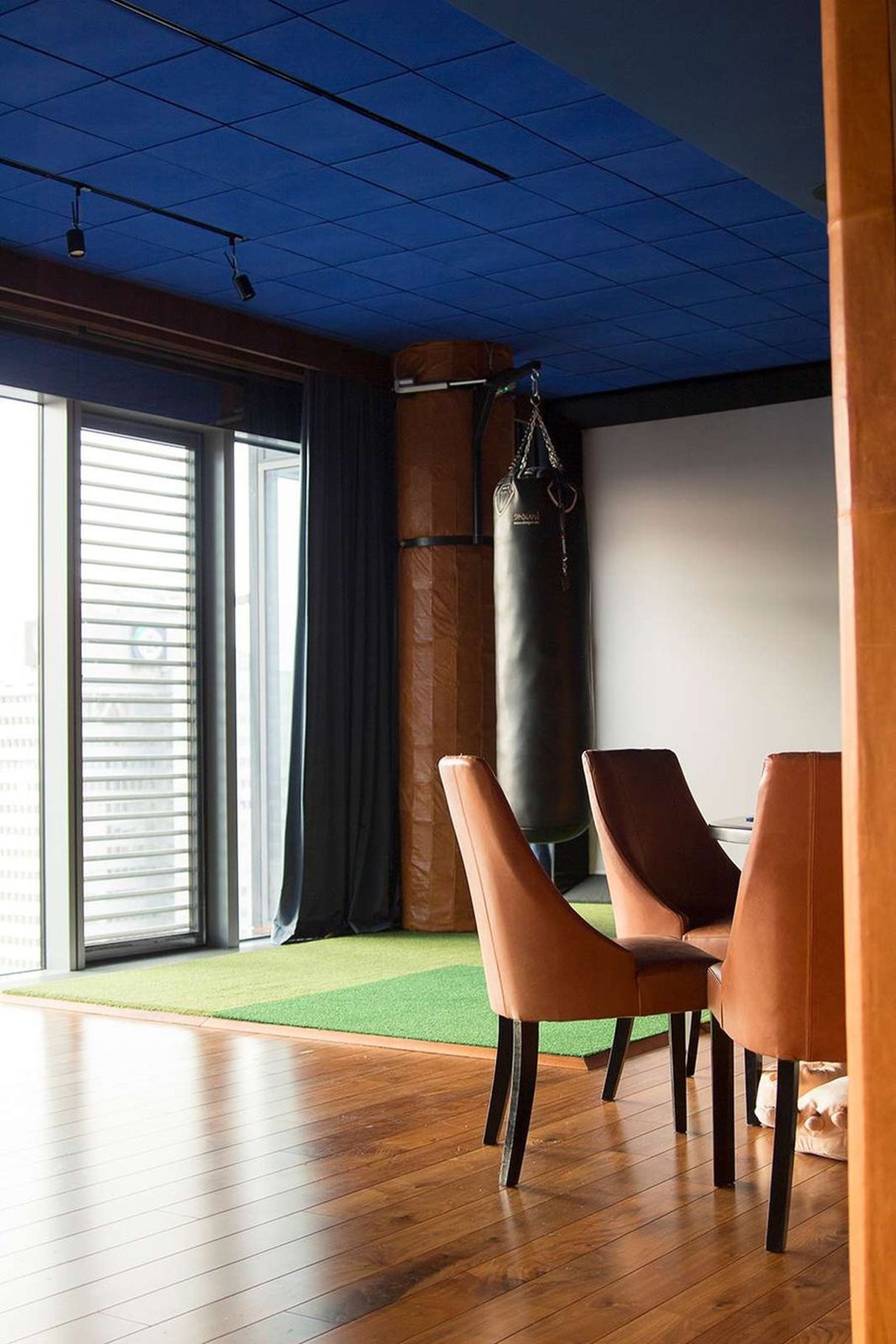 Na uwagę zasługują ściany i sufit wykończone akustycznymi panelami, które nadają przestrzeni intymny, wyciszony charakter. Zastosowane materiały pochłaniają dźwięk uderzeń wspierając spokój i skupienie, niezbędne podczas treningu. Drewniane lamele oraz miękkie, tapicerowane powierzchnie podkreślają luksusowy charakter wnętrza.