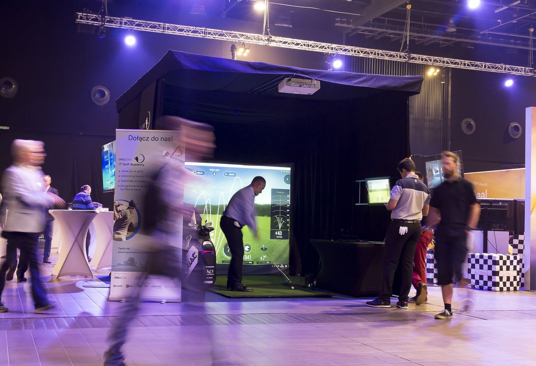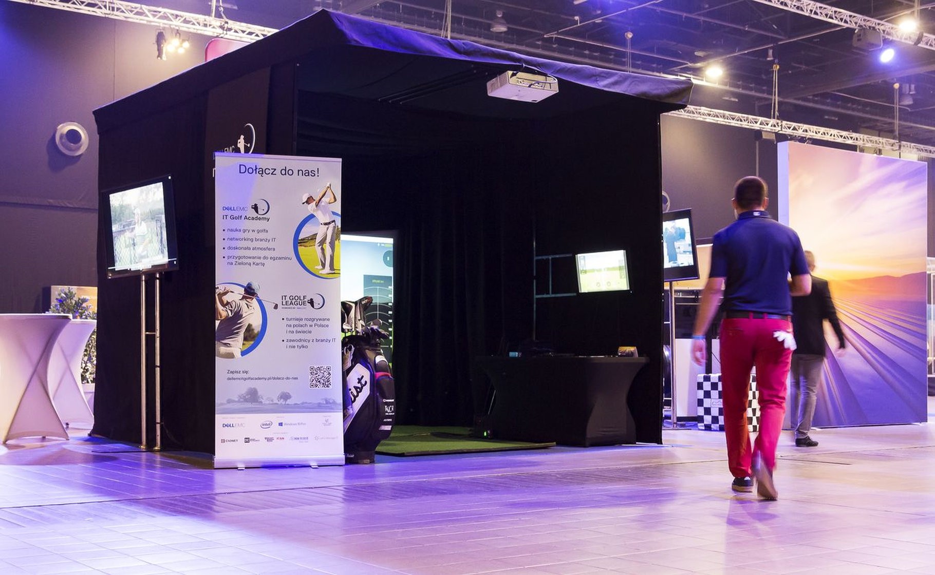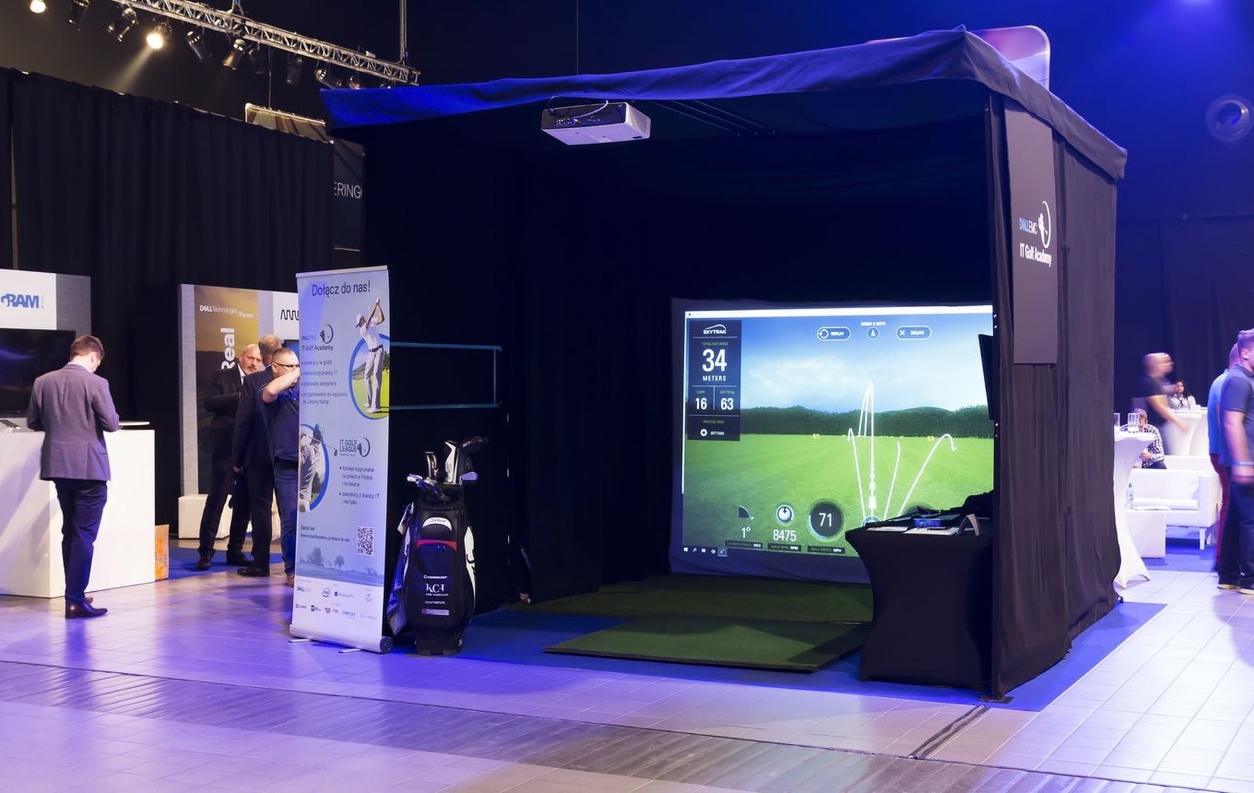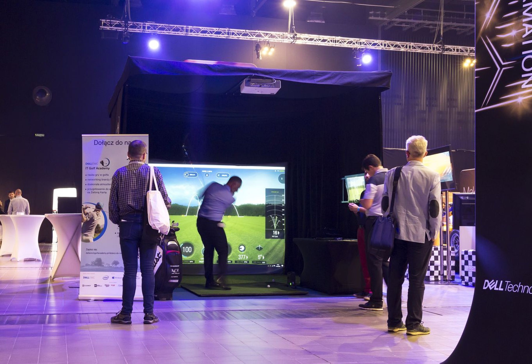 W środku jest wszystko, czego potrzeba do gry w golfa: profesjonalna mata, komplet kijów w stojaku, dodatkowy monitor do podglądu wyników oraz stolik techniczny z komputerem sterującym symulatorem. Całość jest bezpieczna – konstrukcja z kotarami bocznymi przechwytuje niecelne uderzenia, więc można grać nawet w garniturze i to w centrum hali targowej.
