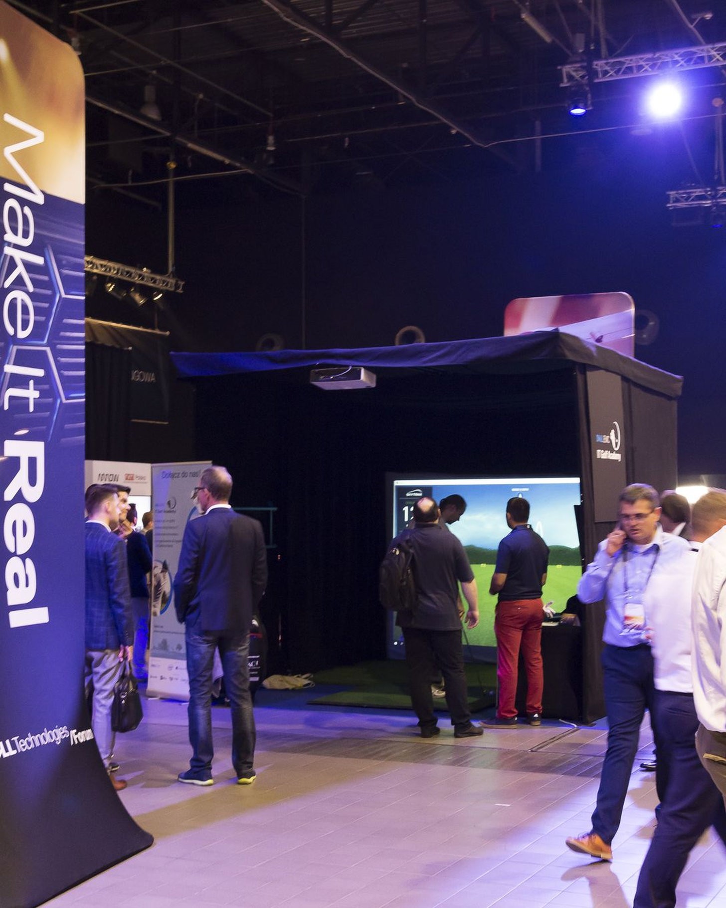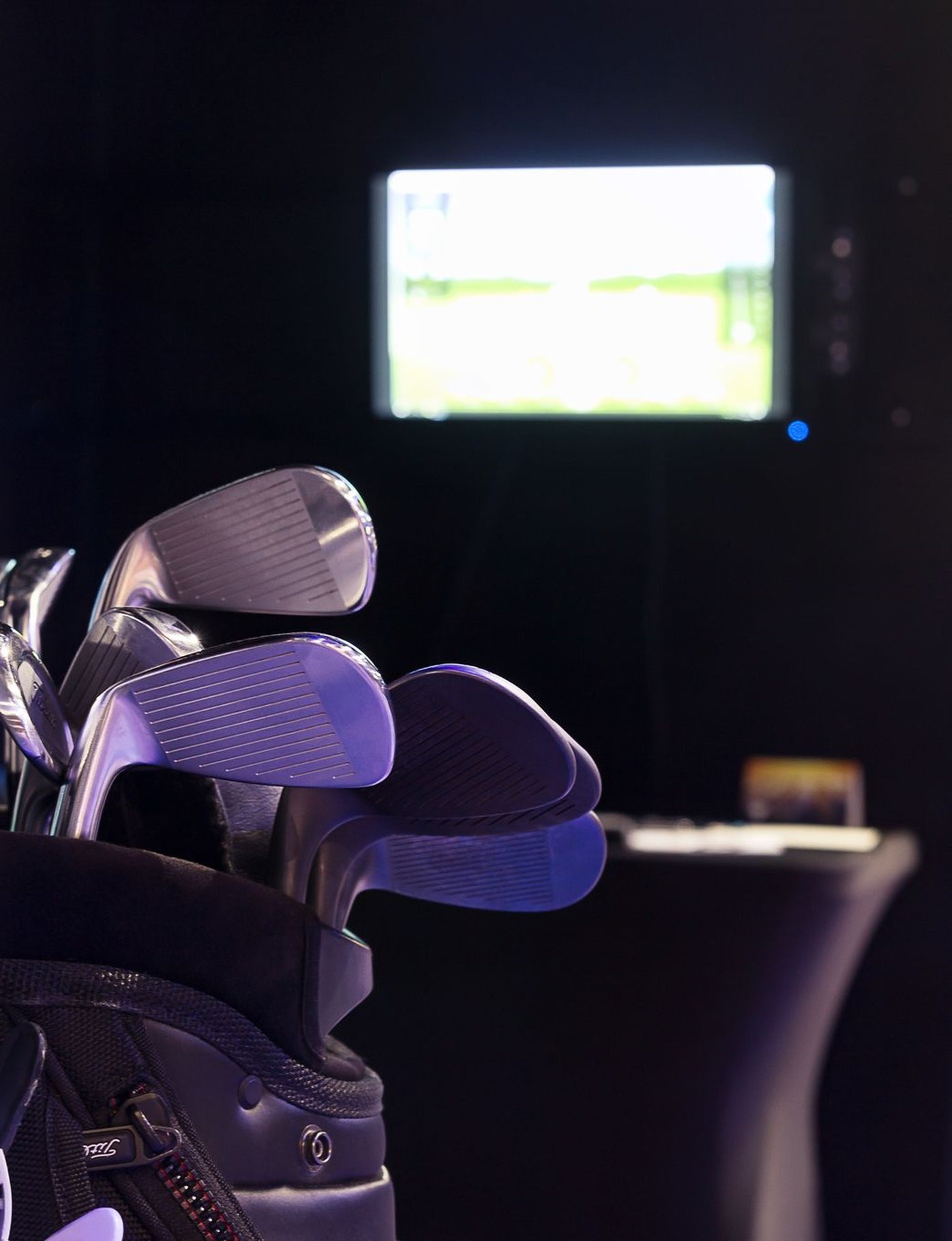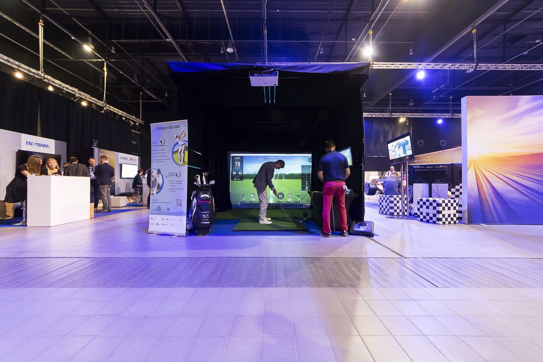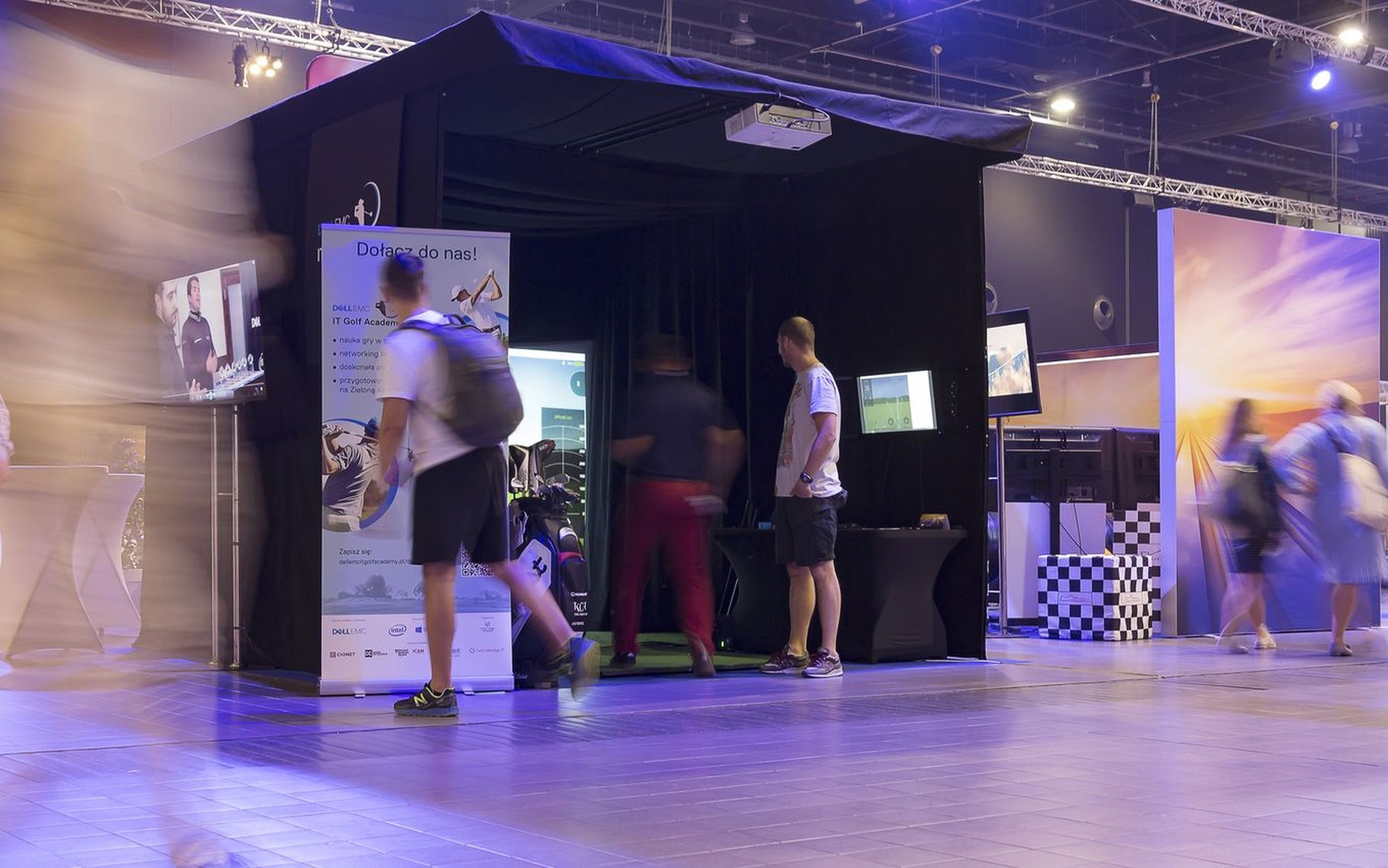 W środku jest wszystko, czego potrzeba do gry w golfa: profesjonalna mata, komplet kijów w stojaku, dodatkowy monitor do podglądu wyników oraz stolik techniczny z komputerem sterującym symulatorem. Całość jest bezpieczna – konstrukcja z kotarami bocznymi przechwytuje niecelne uderzenia, więc można grać nawet w garniturze i to w centrum hali targowej.