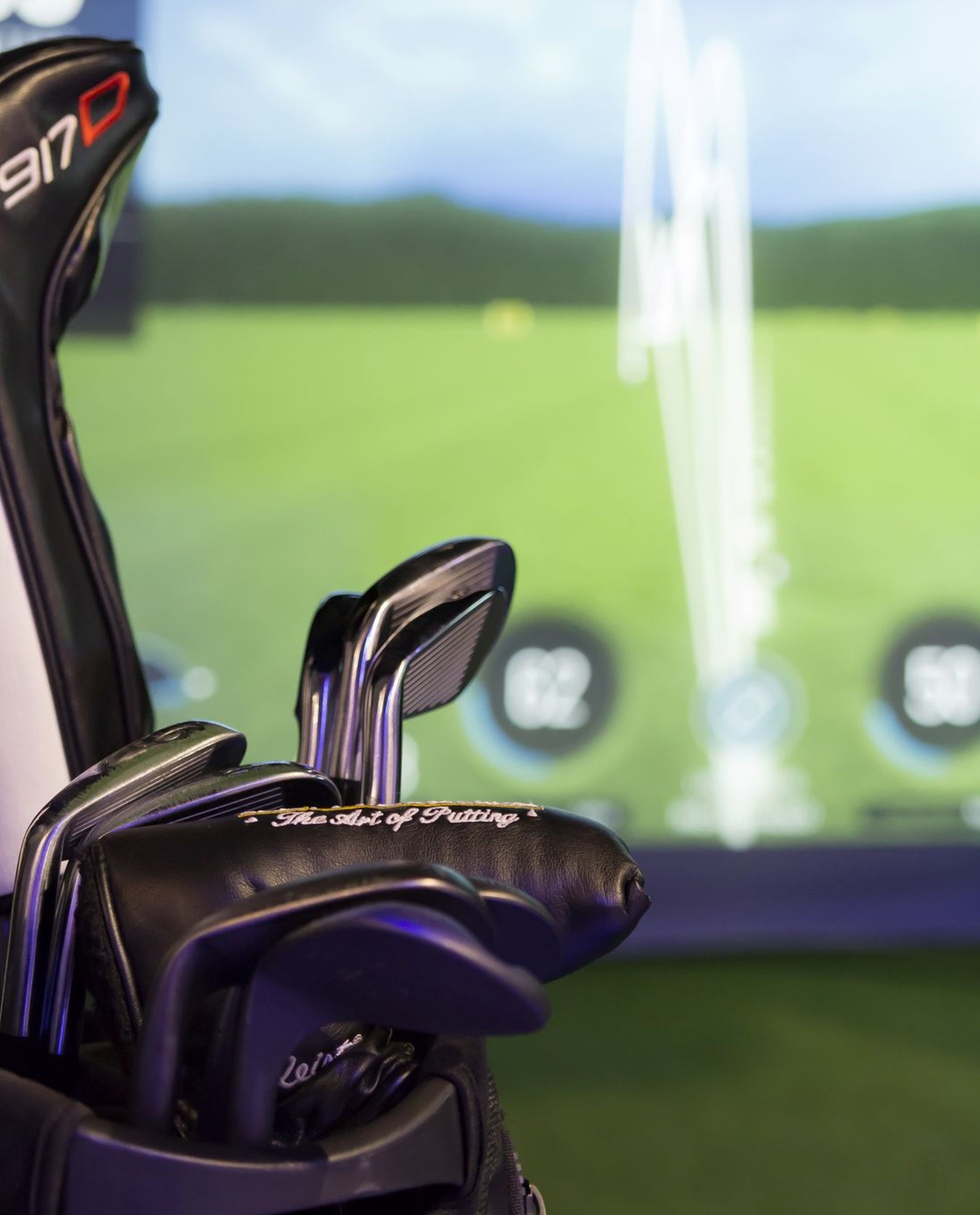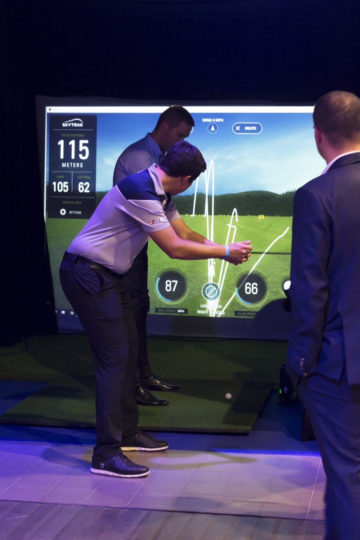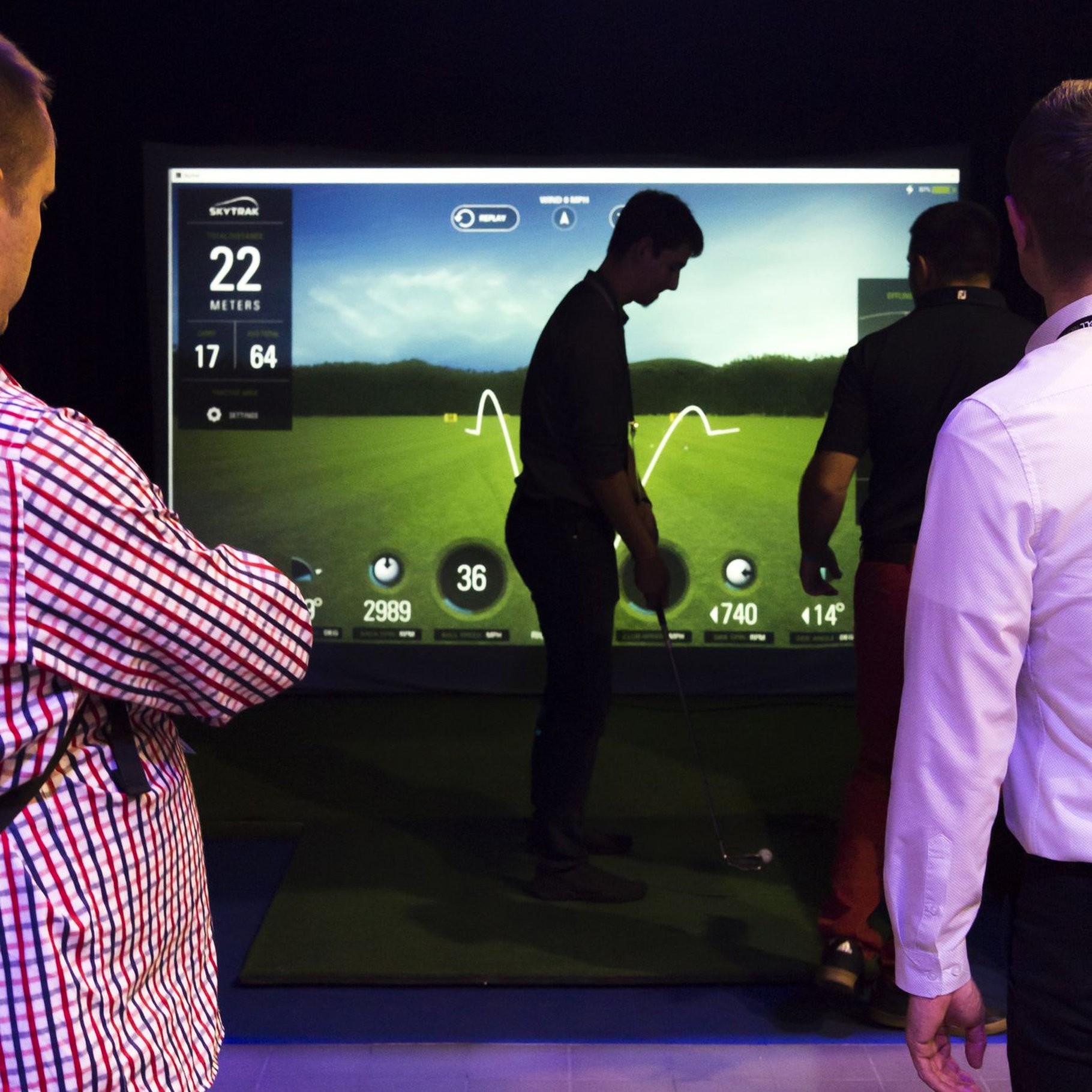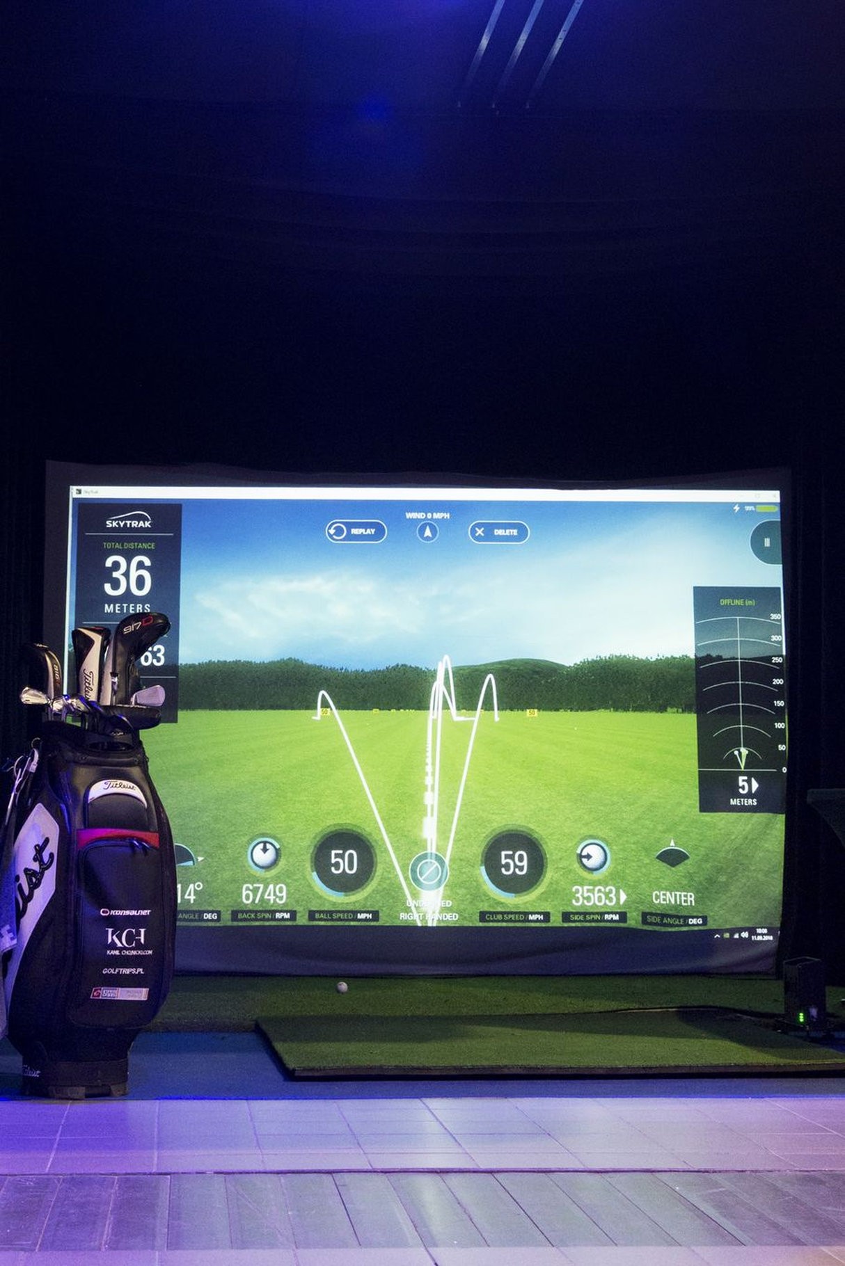Całość zamknięta jest w czarnej, wyciszonej konstrukcji typu „cage”, z projektorem montowanym pod sufitem oraz dużym ekranem uderzeniowym, na którym widać wirtualne pole. W tym przypadku pracuje system SkyTrak – radar/launch monitor ustawiony przy piłce, na macie uderzeniowej. Taka konfiguracja pozwala mu dokładnie odczytywać parametry lotu piłki czy pracy kija. Dane są od razu wyświetlane na ekranie – dlatego wokół szybko gromadzi się grupa zainteresowanych.