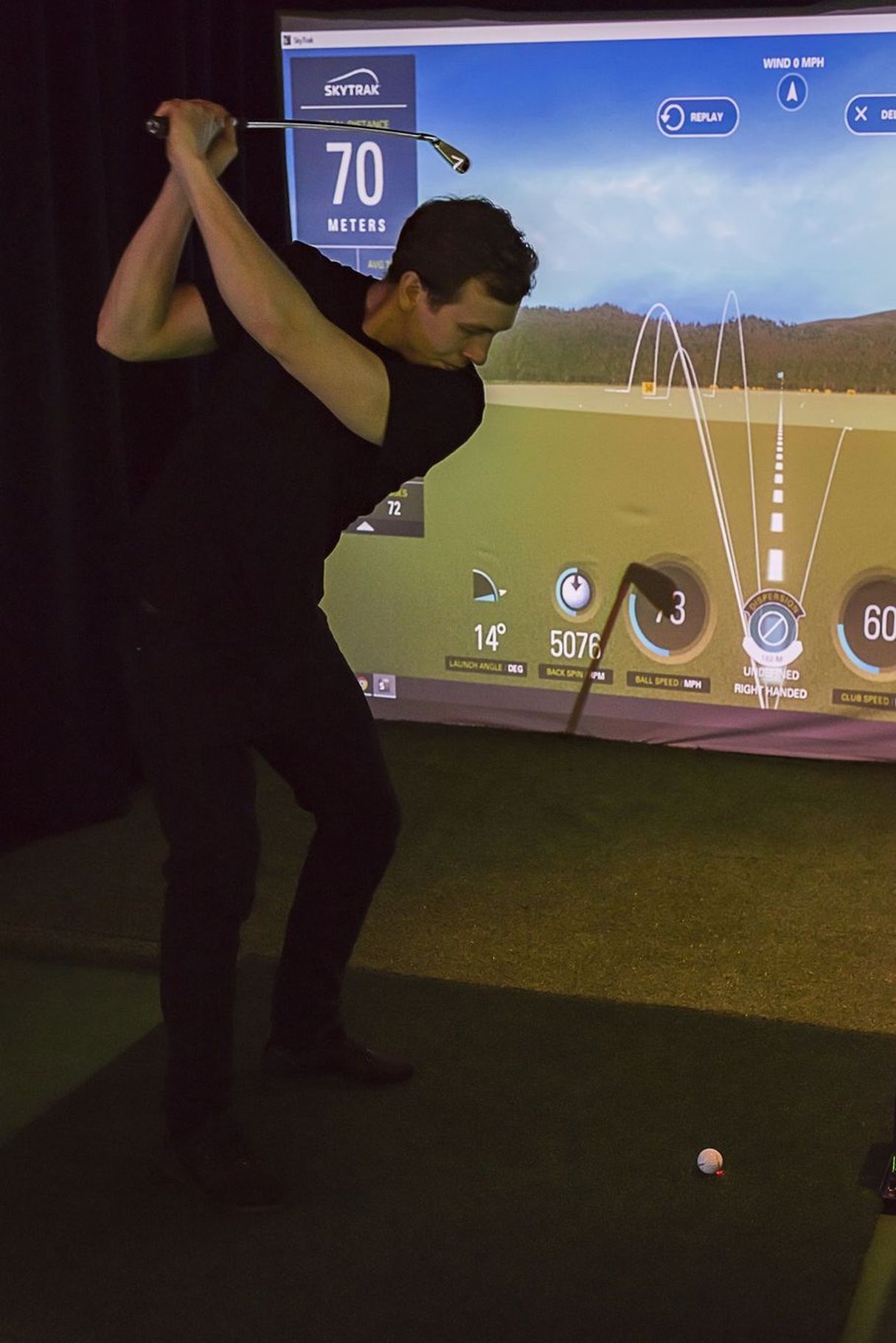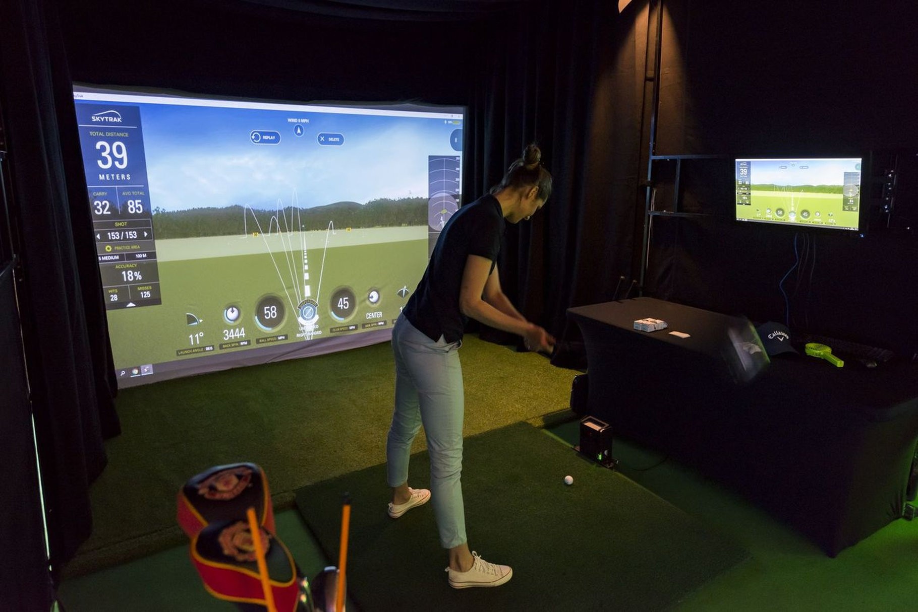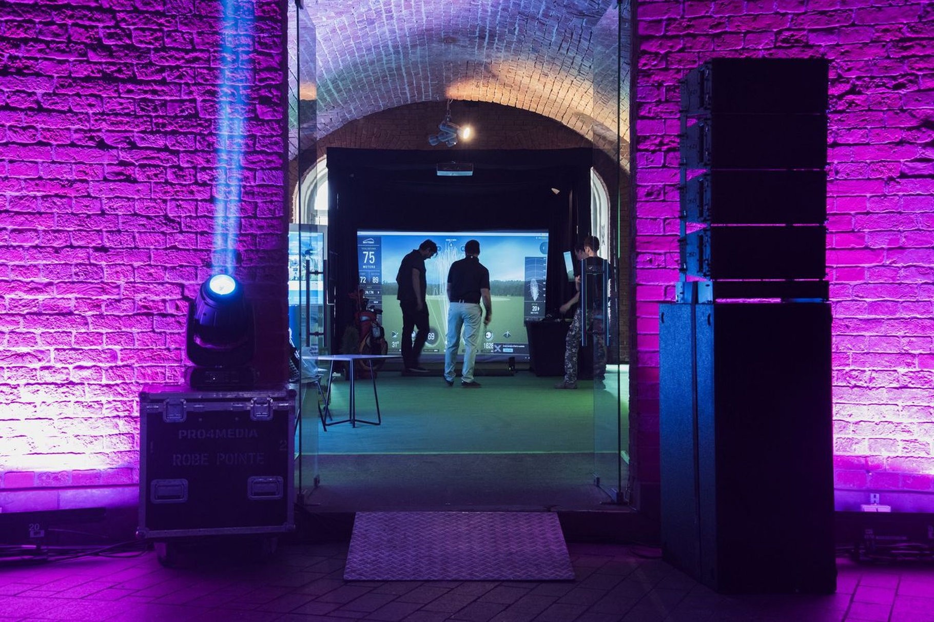 Użyliśmy tutaj radaru SkyTrak, który działa w oparciu o fotometryczny pomiar lotu piłki. Montowany przy macie uderzeniowej, tuż obok piłki gwarantuje bardzo dokładny odczyt kluczowych parametrów takich jak prędkość piłki, kąt startu, spin czy kierunek i długość lotu. Dzięki temu każdy uczestnik eventu może od razu zobaczyć swoje wyniki na dużym ekranie – wraz z trajektorią lotu piłki i podsumowaniem uderzenia.