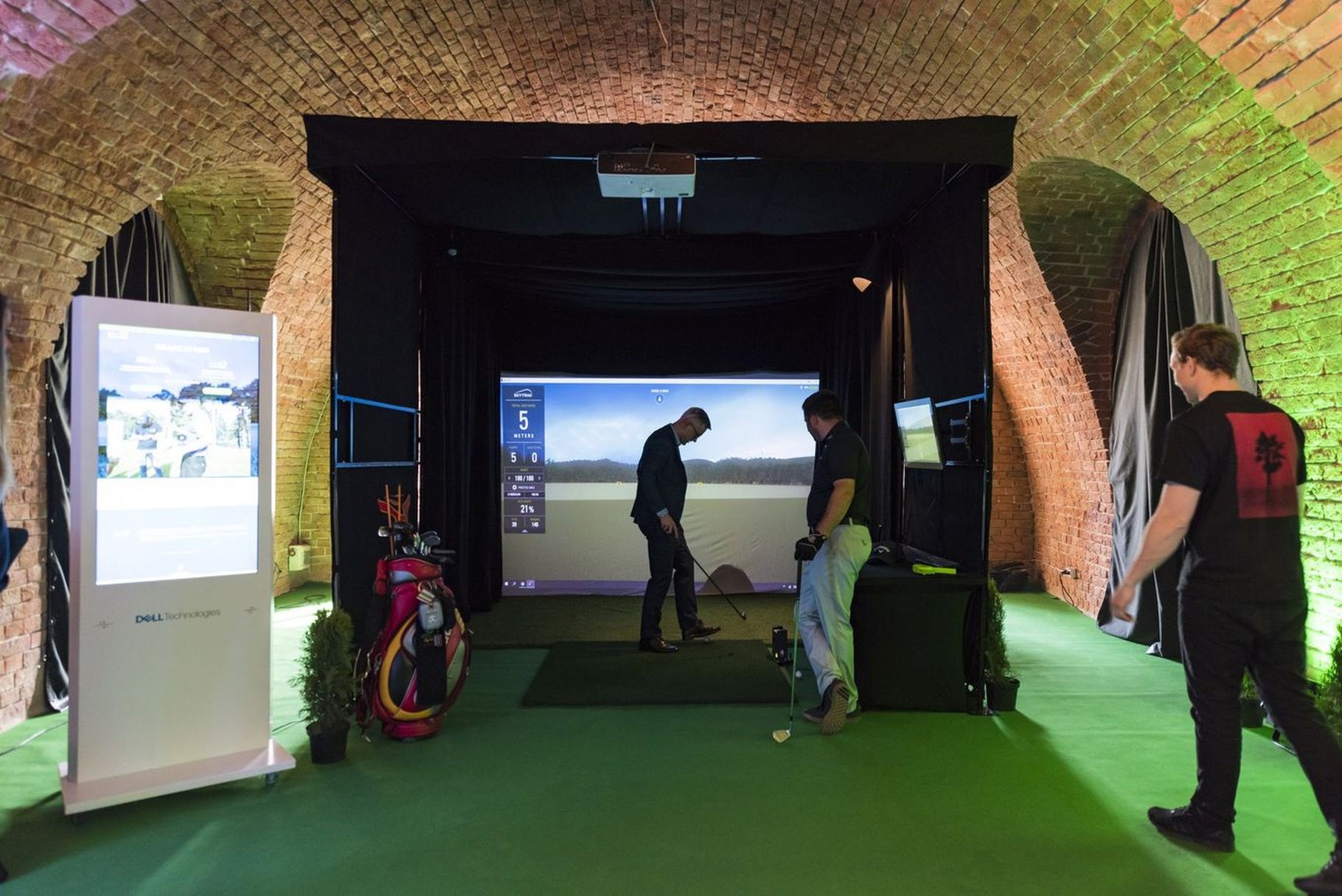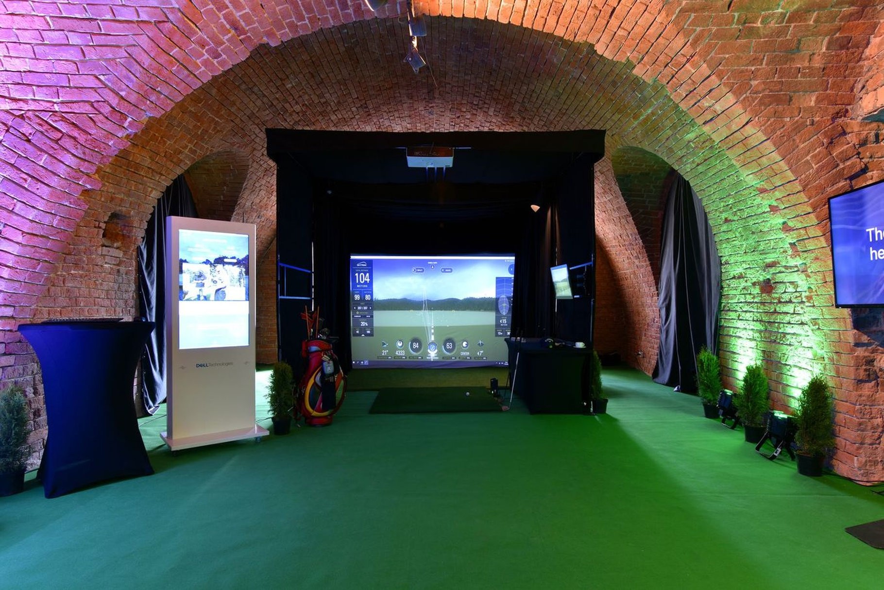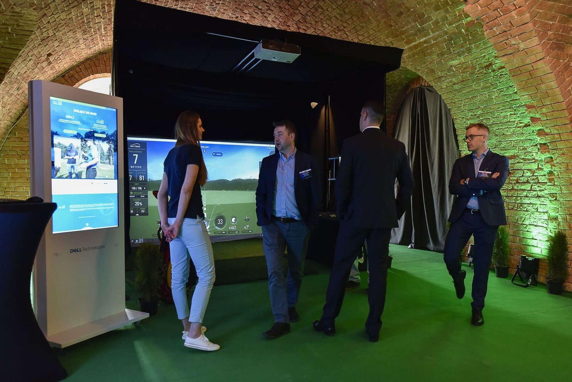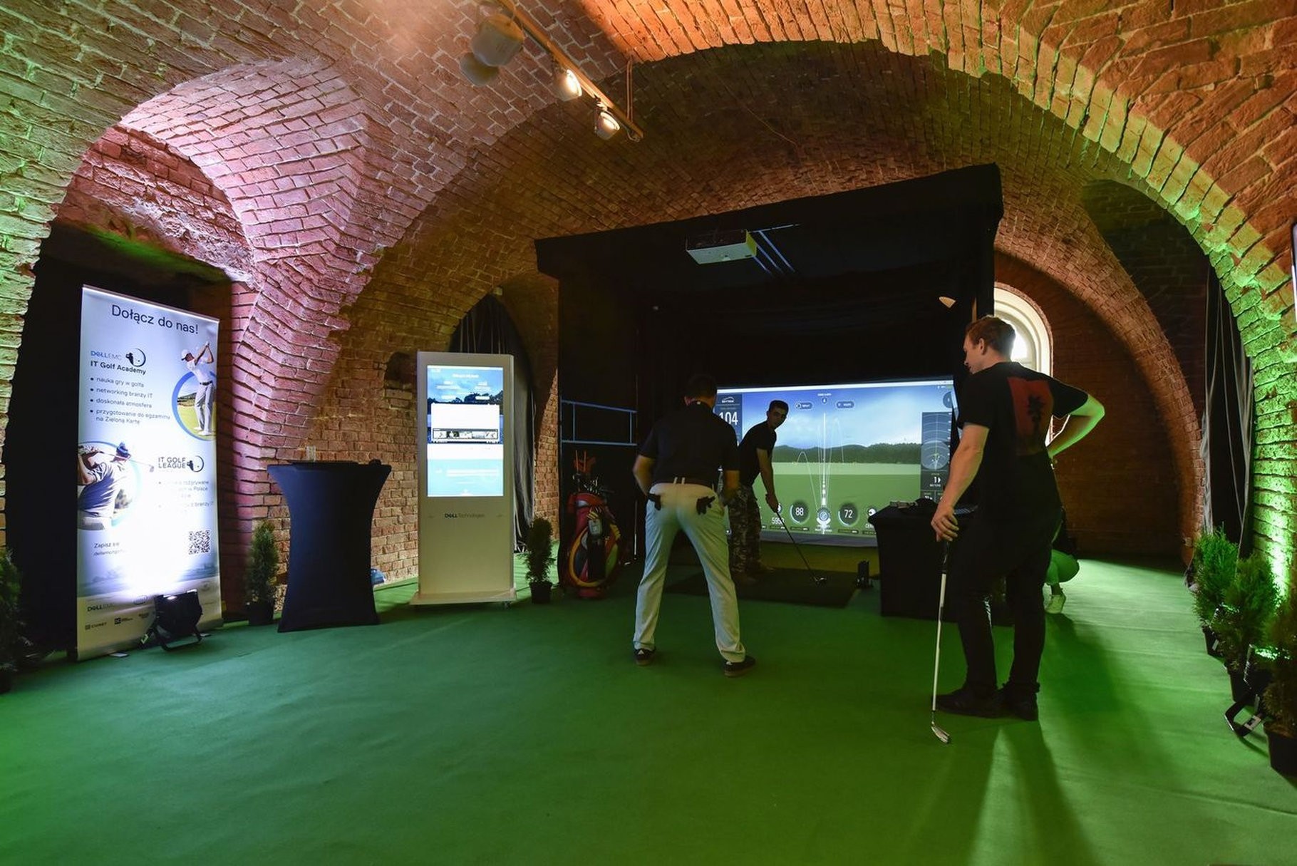 Mobilny symulator golfowy na evencie organizowanym przez Dell Technologies - świetnie wpasował się w jego klimat. Zamknięta konstrukcja GOLF CAGE z odpowiednim oświetleniem i pełnym brandingiem została ustawiona pod sklepieniem ceglanych murów. Całość jest osobną strefę sportowej rozrywki, która z miejsca przyciągnęła uwagę gości.