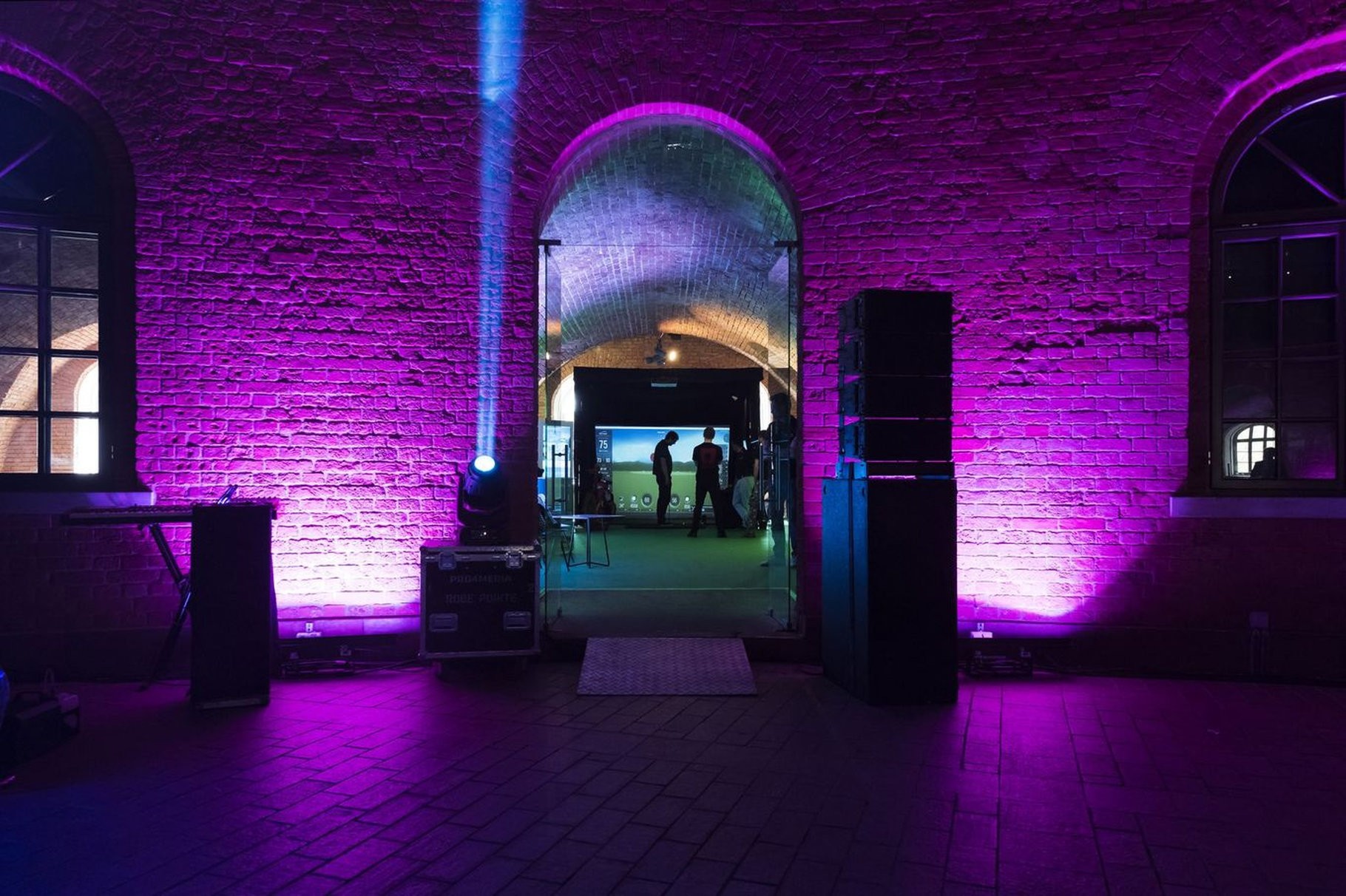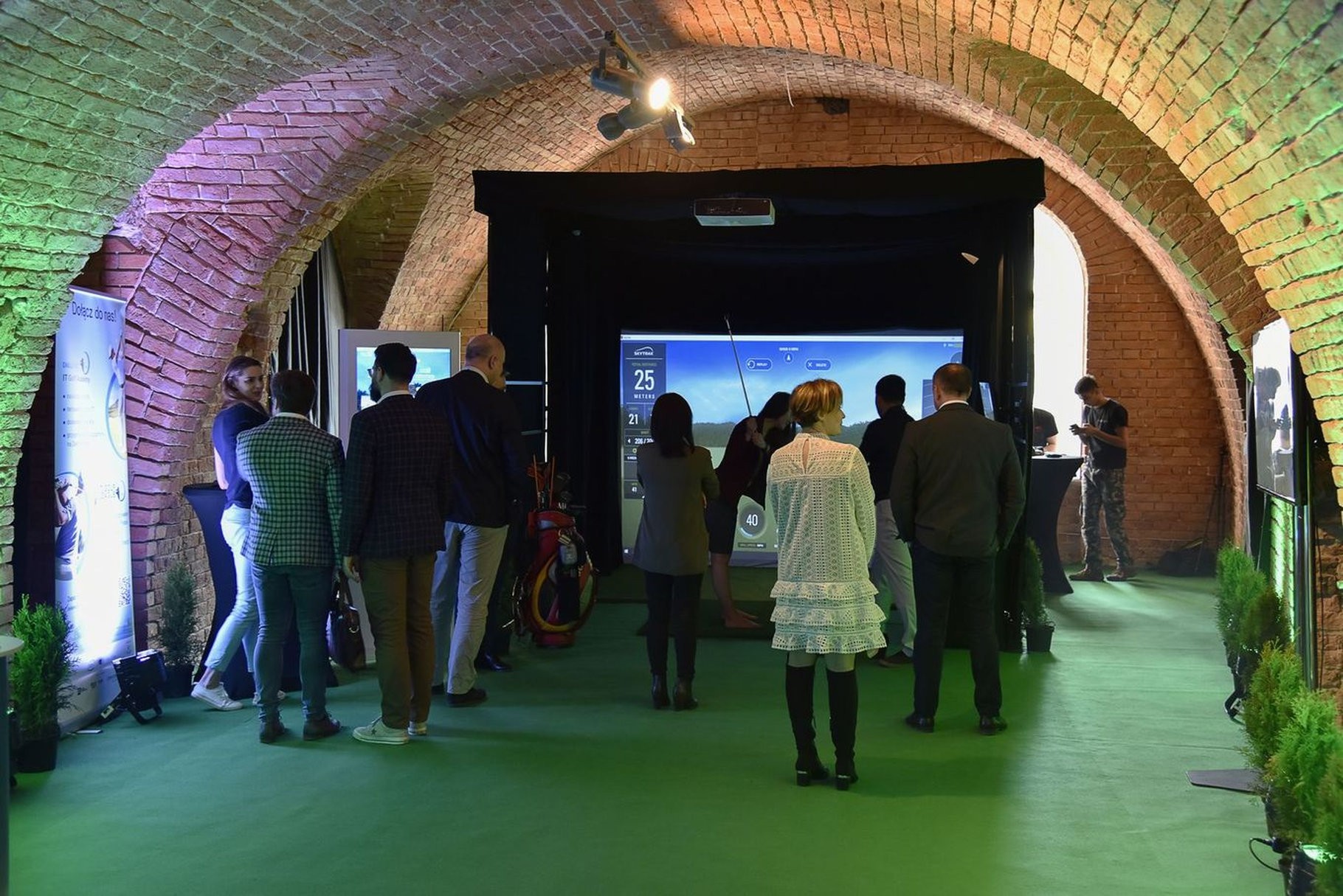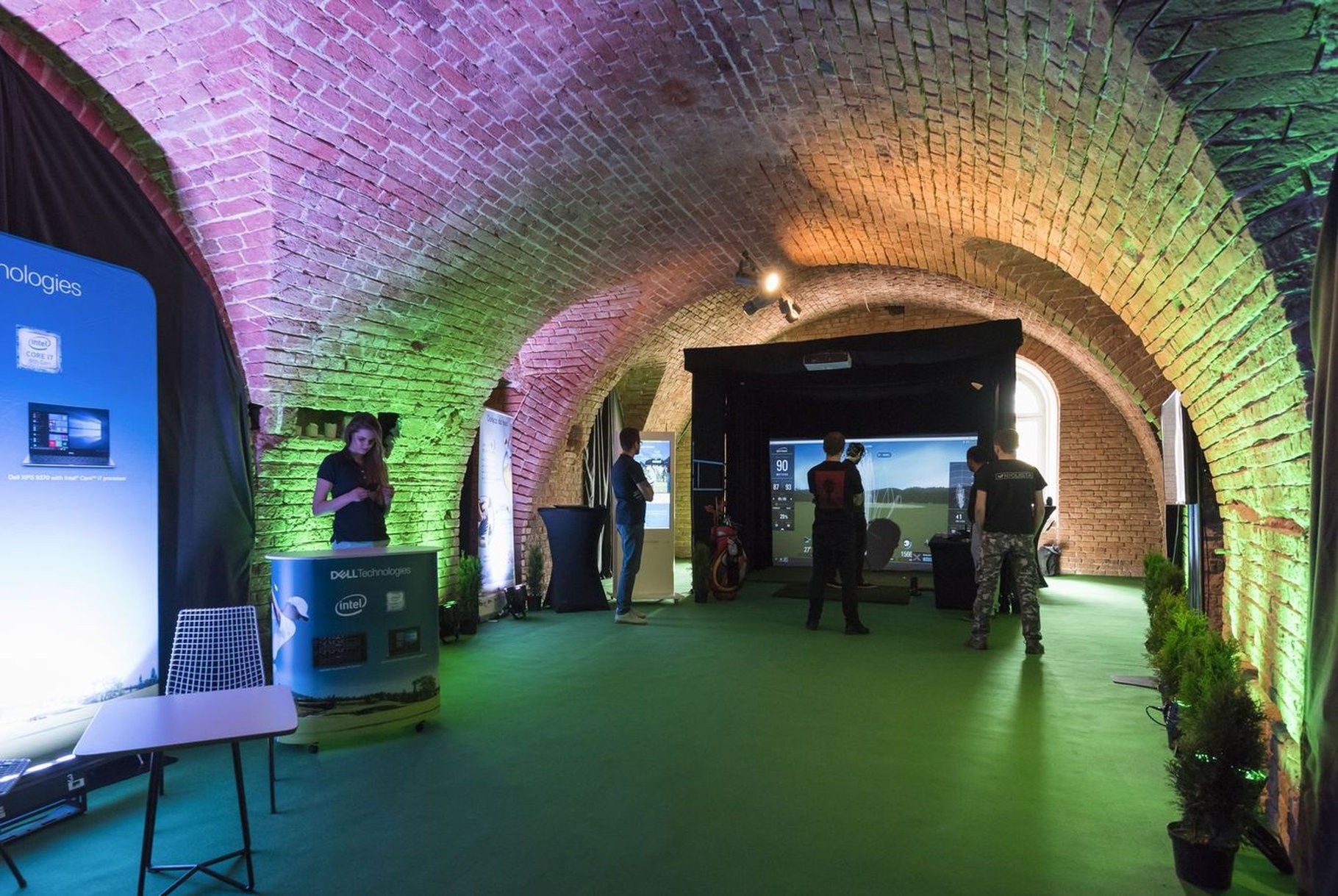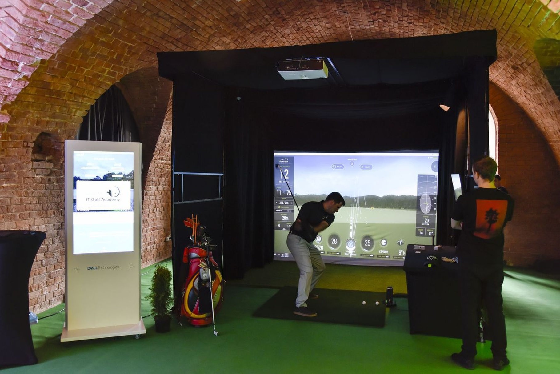 Mobilny symulator golfowy na evencie organizowanym przez Dell Technologies - świetnie wpasował się w jego klimat. Zamknięta konstrukcja GOLF CAGE z odpowiednim oświetleniem i pełnym brandingiem została ustawiona pod sklepieniem ceglanych murów. Całość jest osobną strefę sportowej rozrywki, która z miejsca przyciągnęła uwagę gości.