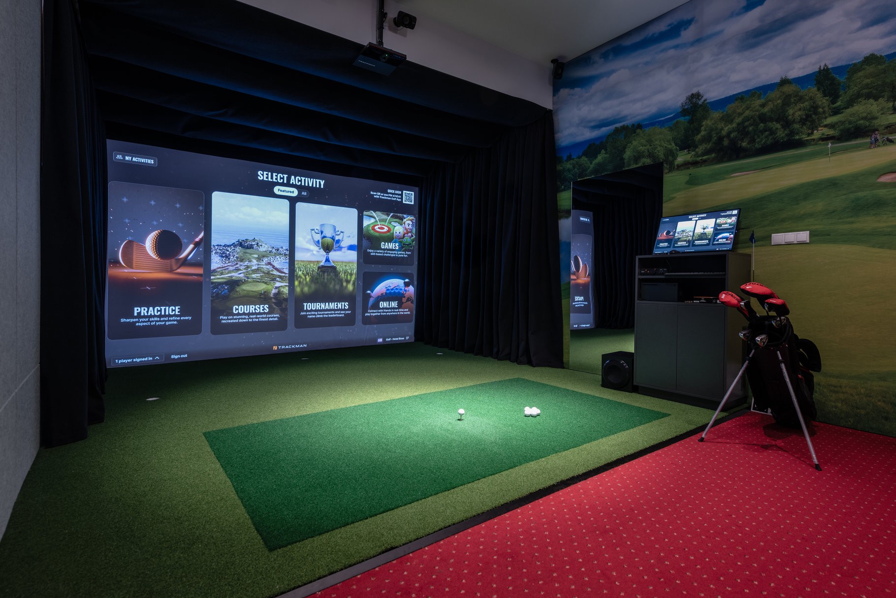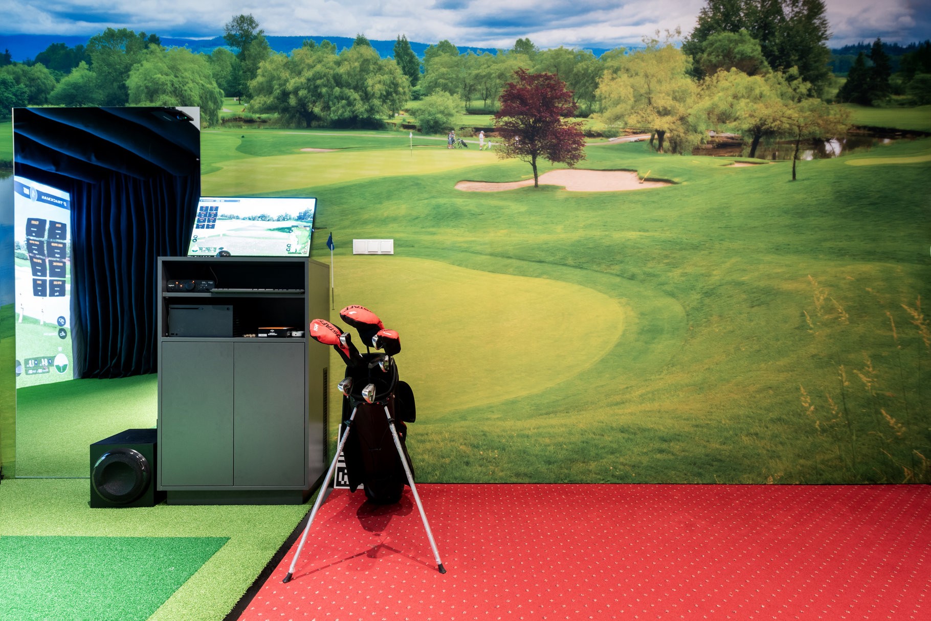 Przestrzeń została dodatkowo wyciszona za pomocą kotar akustycznych, które oddzielają strefę gry od otoczenia, wypływając pozytywnie na komfort i skupienie zawodnika. Zabudowa techniczna z dedykowanym stanowiskiem komputerowym i panelem sterowania umożliwia intuicyjną obsługę systemu TrackMan oraz szybki dostęp do danych treningowych.