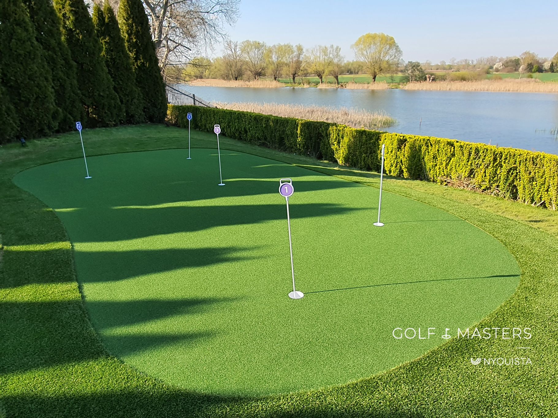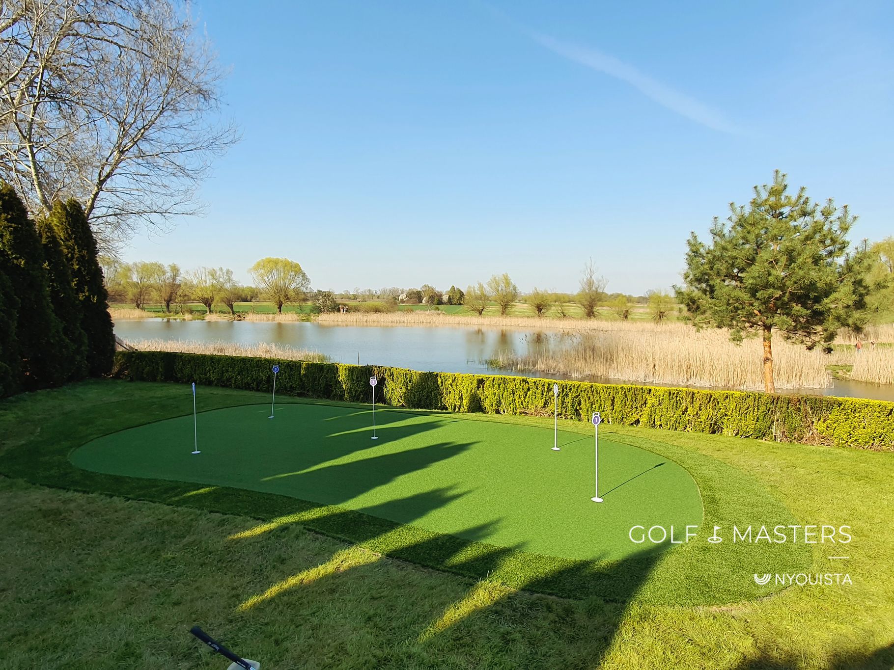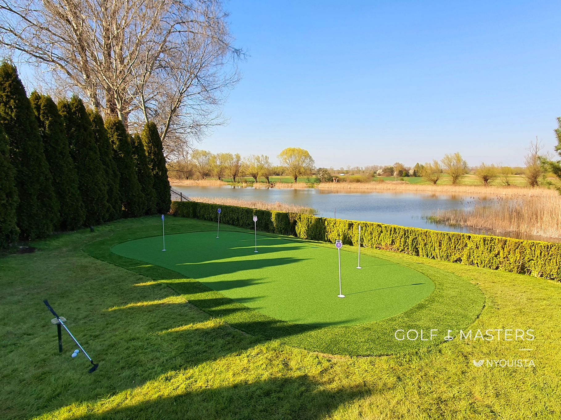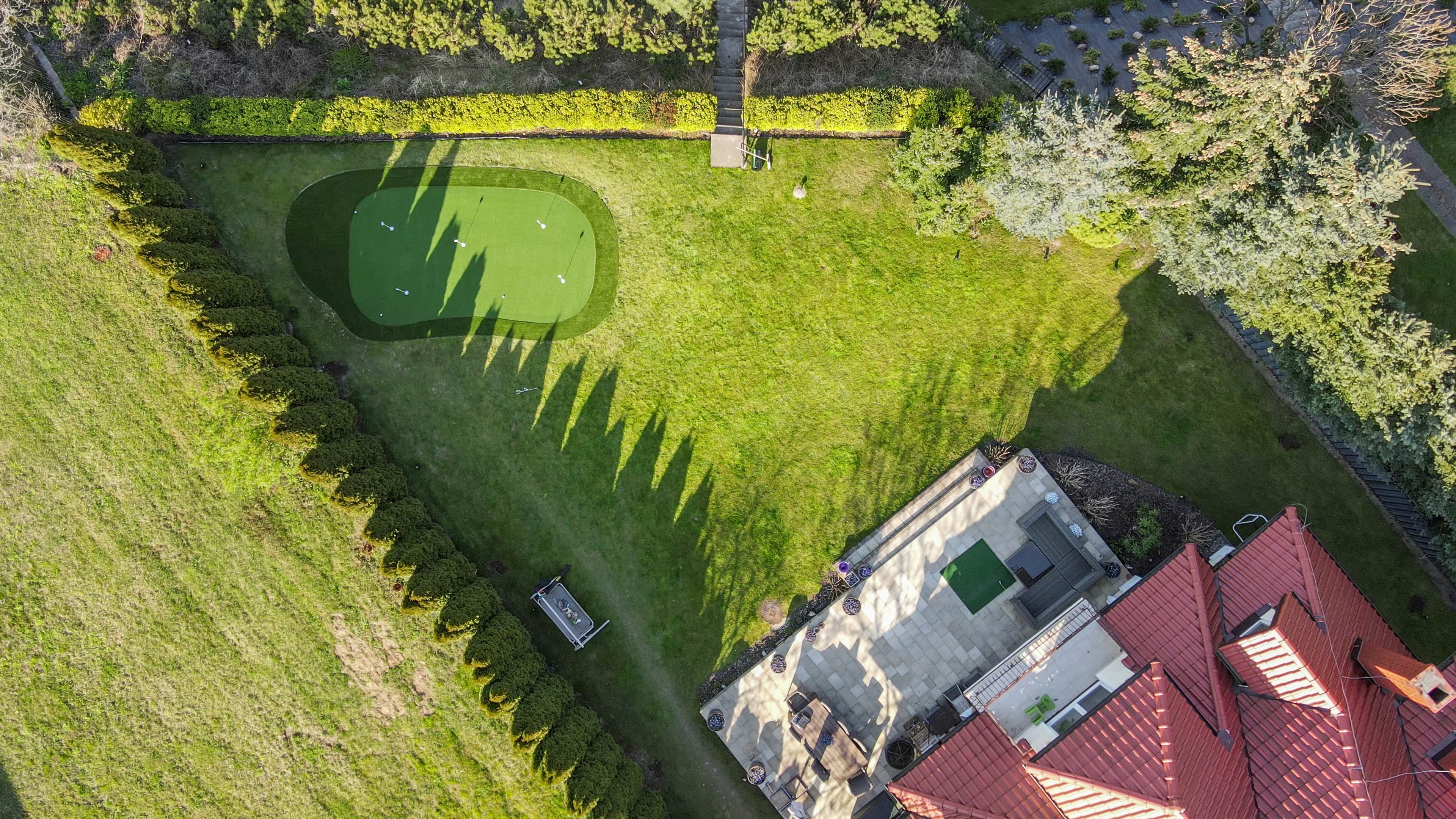 Otoczony zadbanym żywopłotem i miękką linią trawnika, fragment profesjonalnego pola przeniesiony wprost do prywatnego ogrodu. Elegancko wyprofilowany green, z kilkoma dołkami treningowymi, pozwala ćwiczyć różne warianty gry.