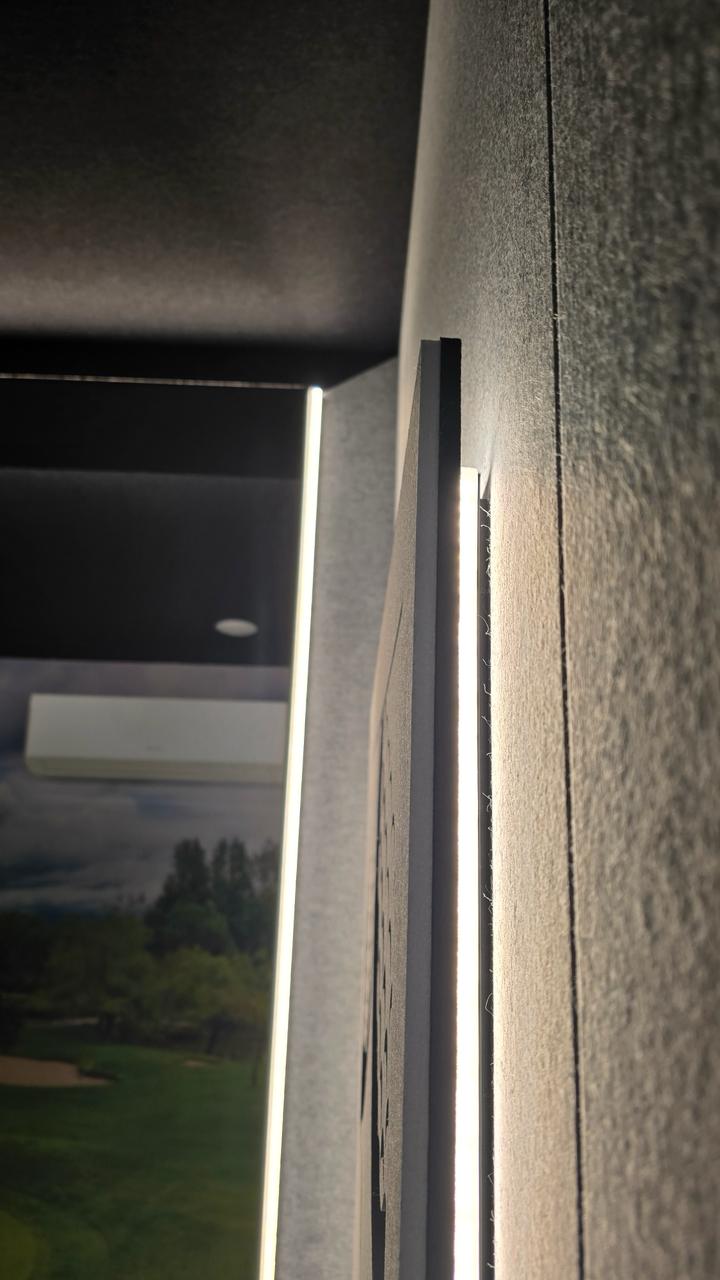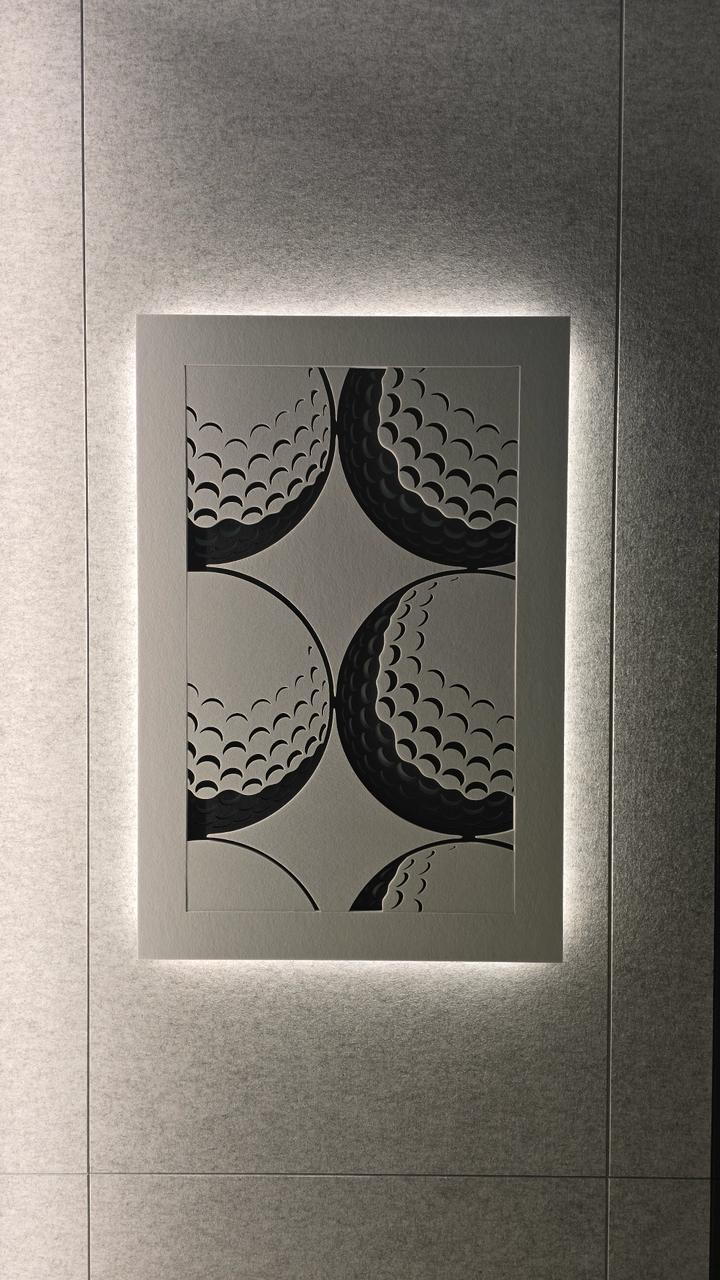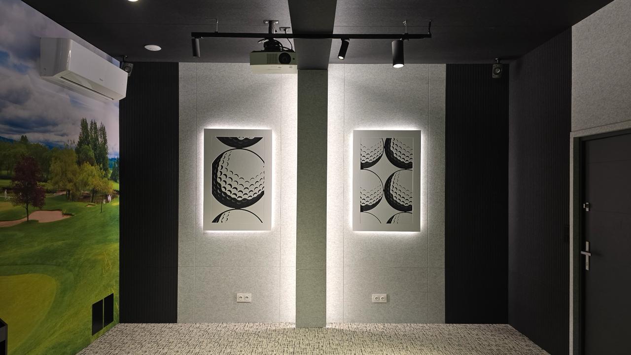 Wyciszone wnętrze, „uspokojone” dzięki rozwiązaniom akustycznym Nyquista. Ściany i sufit pokrywają panele wykonane z ekologicznego materiału PET. Szczególną rolę pełnią obrazy akustyczne, zaprojektowane indywidualnie dla tego projektu. Tłumią hałas związany dźwiękiem uderzeń i budują elegancki, niemal salonowy klimat. To właśnie akustyka sprawia, że przestrzeń działa jak zamknięta kapsuła – intensywna gra nie wydostaje się na zewnątrz, a gracz może w pełni skupić się na rytmie i powtarzalności uderzeń.