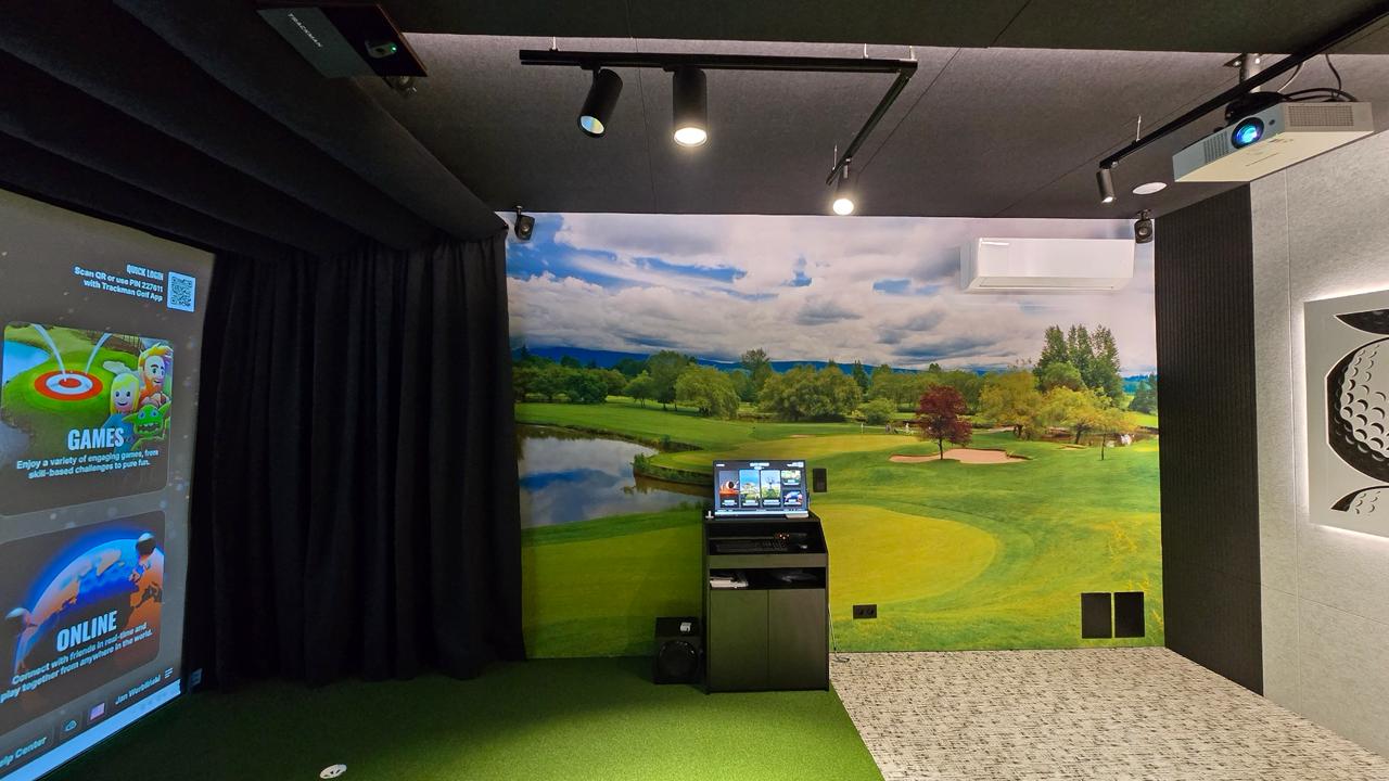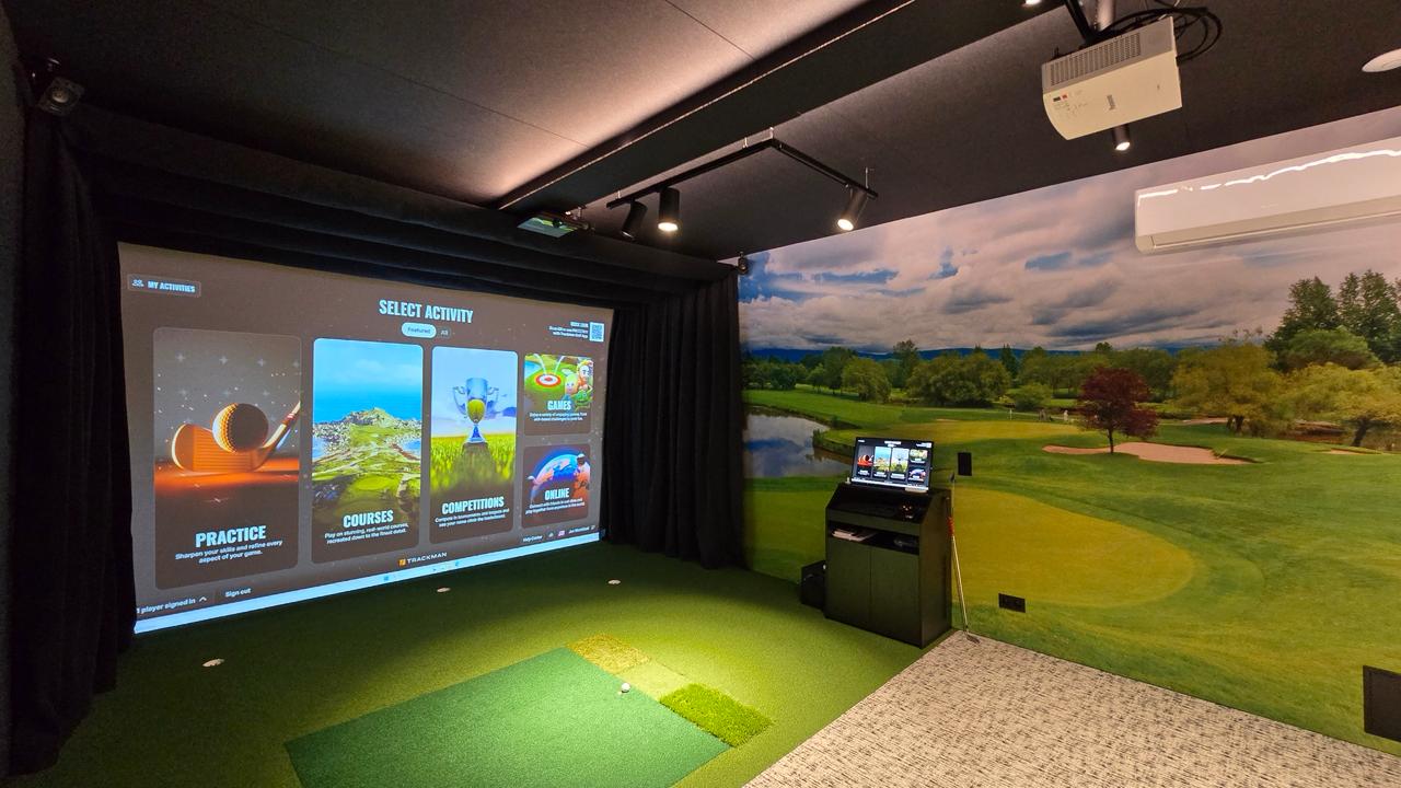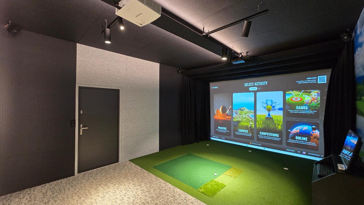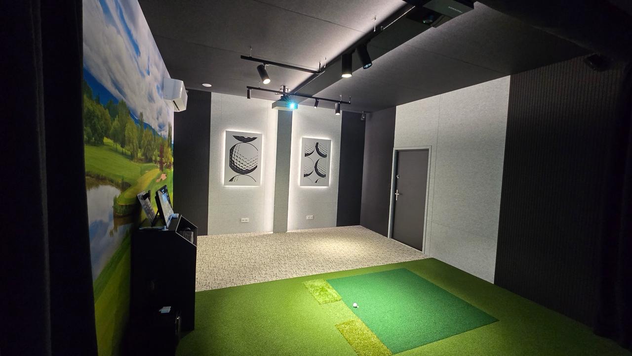 Centralnym punktem jest symulator oparty na technologii TrackMan. Radar, projektor sufitowy i ekran zostały zintegrowane w sposób dyskretny, bez technicznego chaosu. Zielona mata z wyraźnie zaznaczonymi strefami uderzeń kontrastuje z grafitowymi ścianami i miękkim światłem, tworząc wrażenie profesjonalnego studia treningowego, a nie tymczasowej instalacji.
