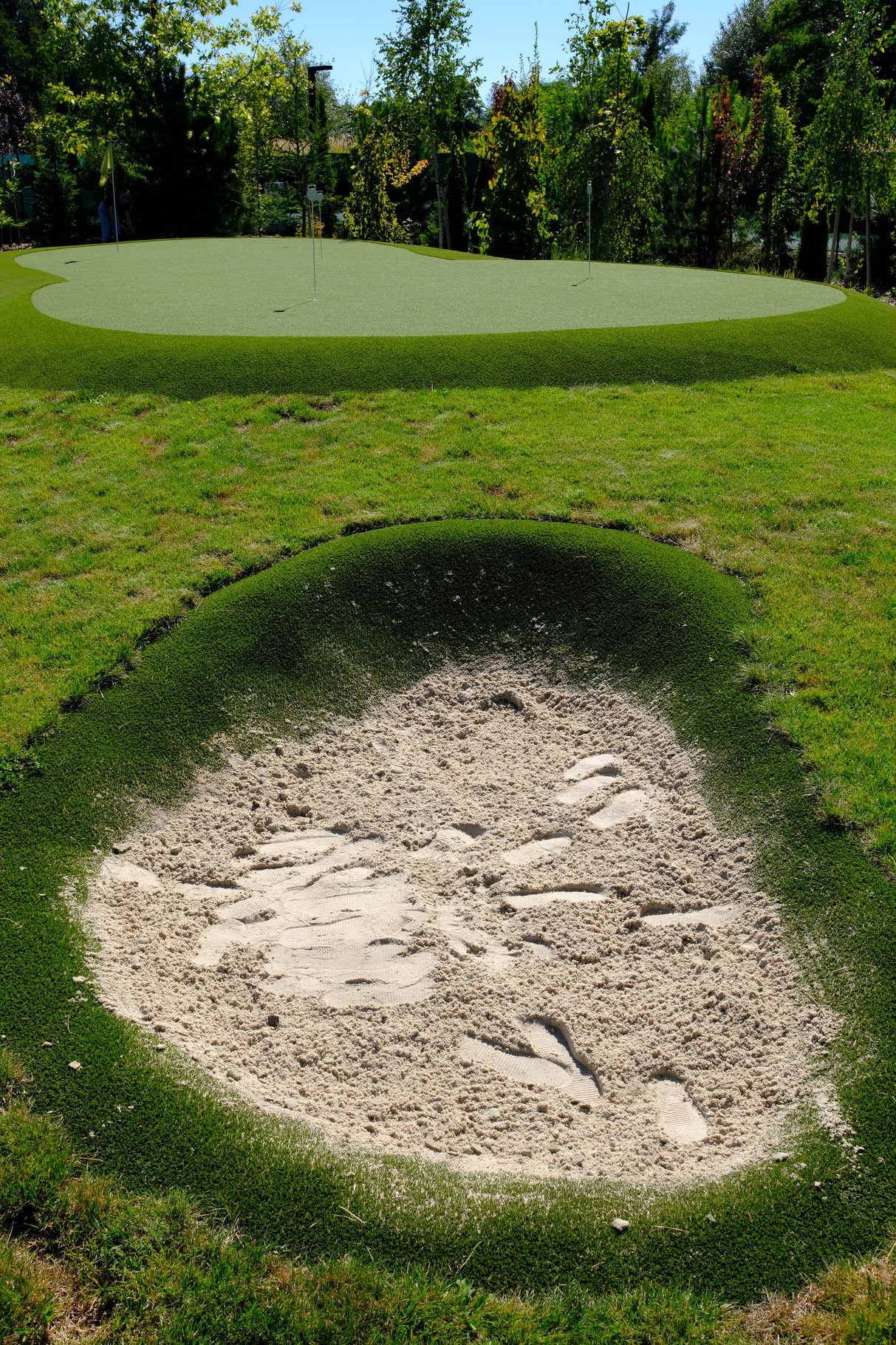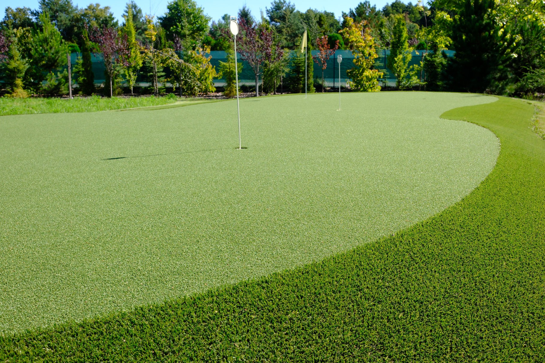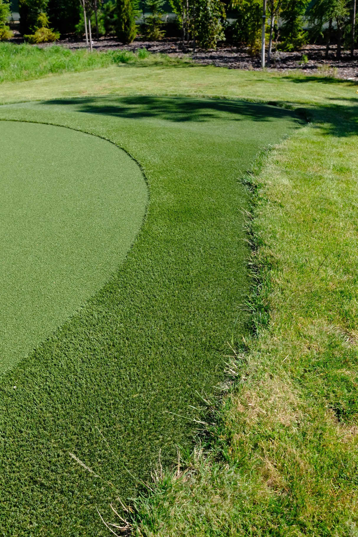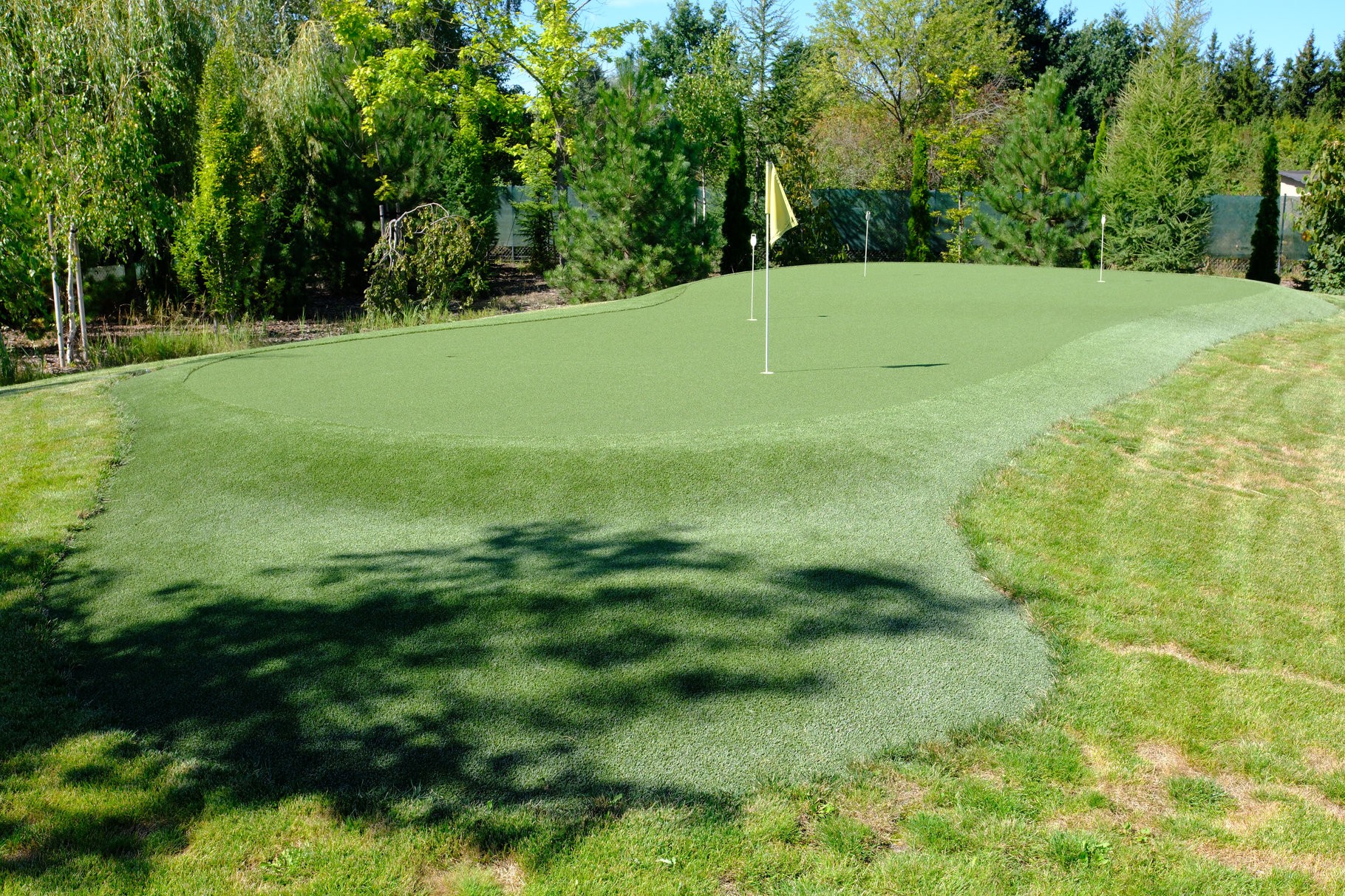 Prezentowany projekt to zaawansowany technicznie green, zaprojektowany z myślą o graczach, dla których kluczowa jest powtarzalność i precyzja „short game”. Zastosowanie najwyższej klasy syntetycznej nawierzchni o stałym parametrze Stimp gwarantuje realistyczne zachowanie piłki, identyczne jak na naturalnej, krótko strzyżonej trawie turniejowej. Architektura greena obejmuje subtelne pofałdowania wymuszające naukę czytania breaków oraz szeroki, gęsty kołnierz (fringe), który służy jako idealne stanowisko do chippingu. Dzięki wielowarstwowej podbudowie i doskonałemu drenażowi, ta prywatna strefa treningowa jest gotowa do gry 365 dni w roku, eliminując żmudną konserwację i pozwalając skupić się wyłącznie na obniżaniu handicapu w najbardziej komfortowych warunkach.