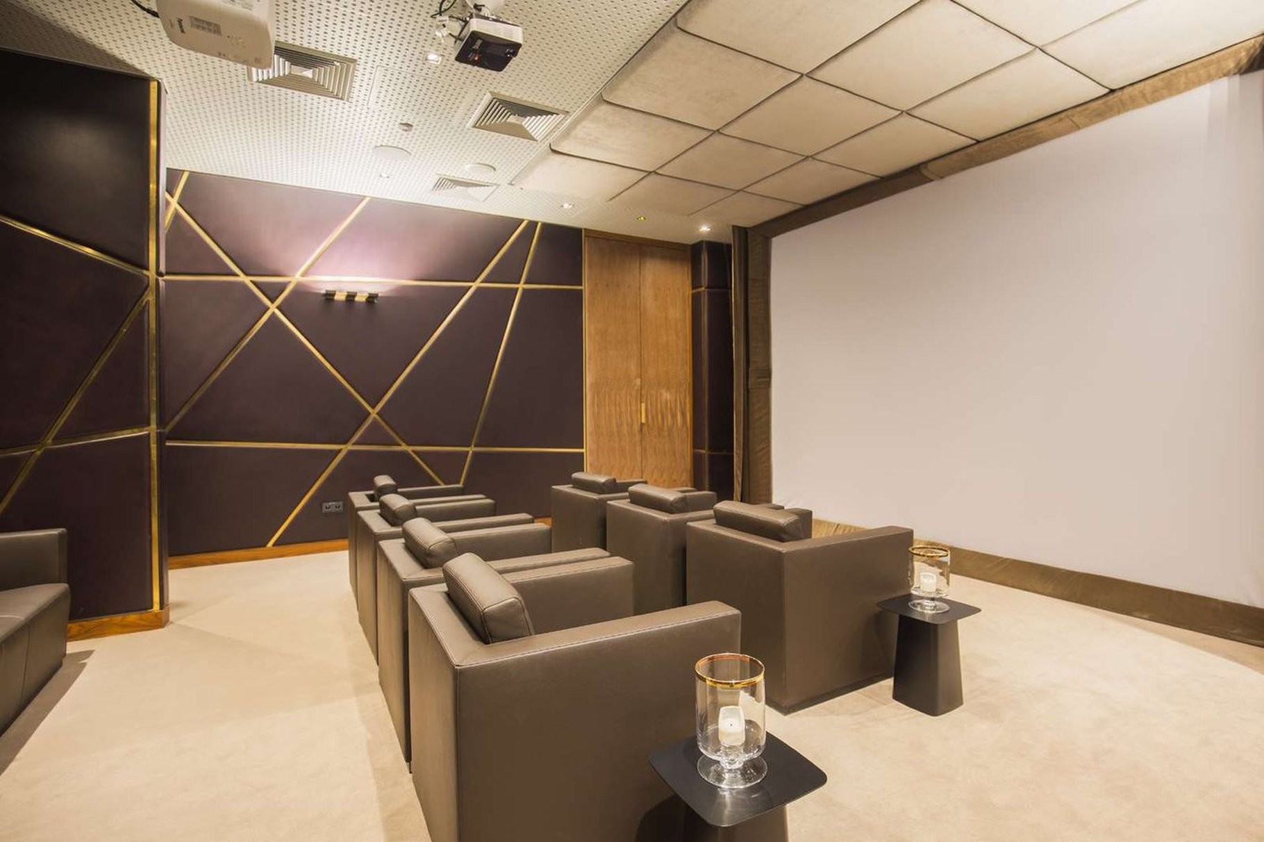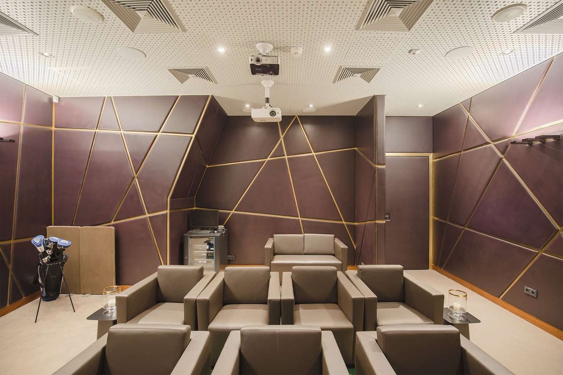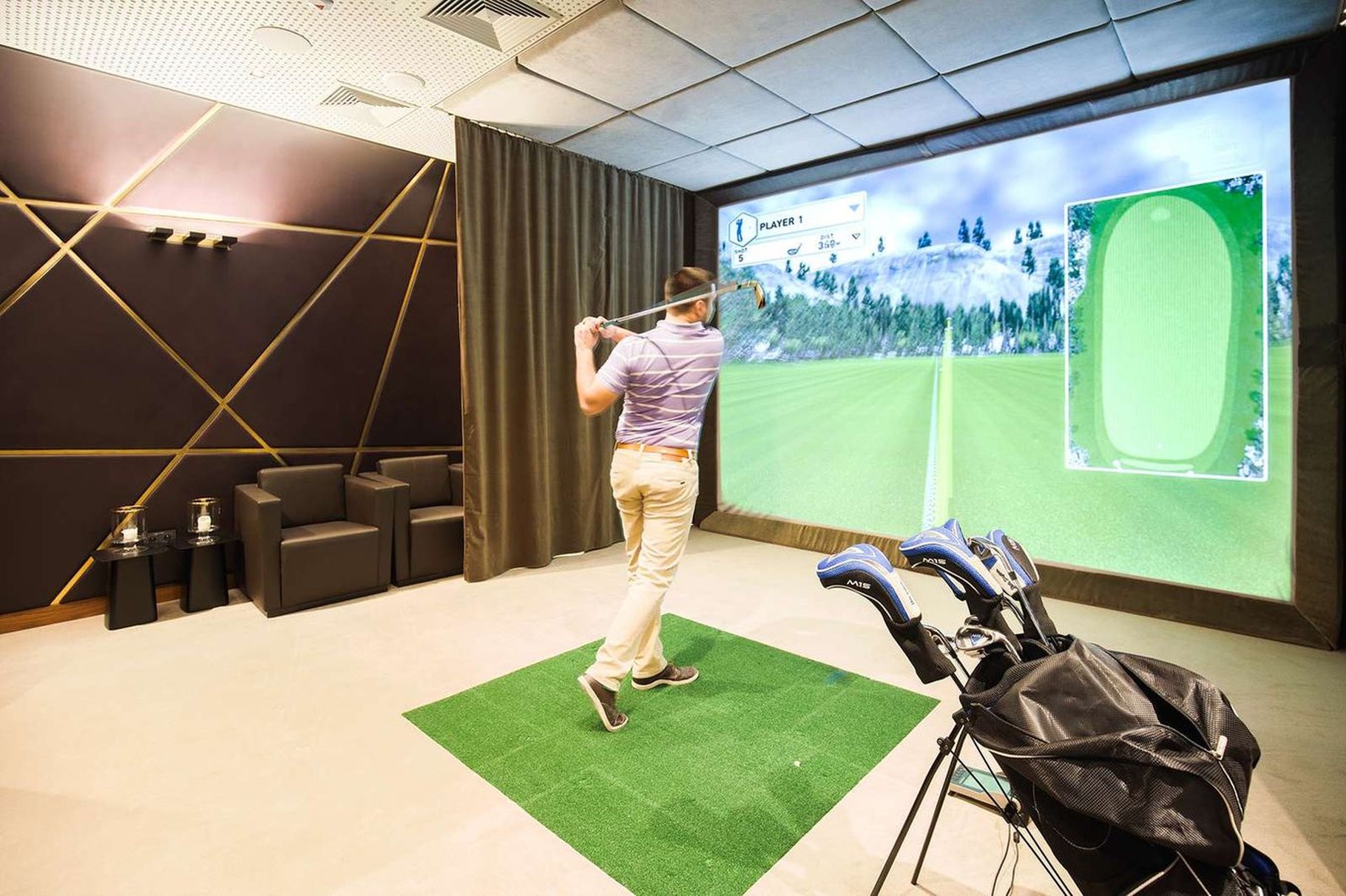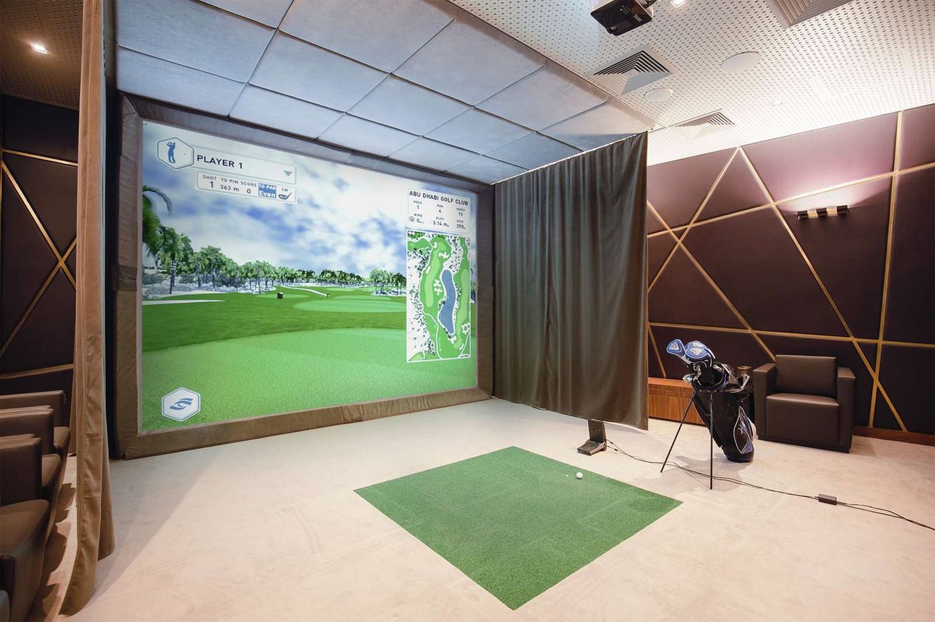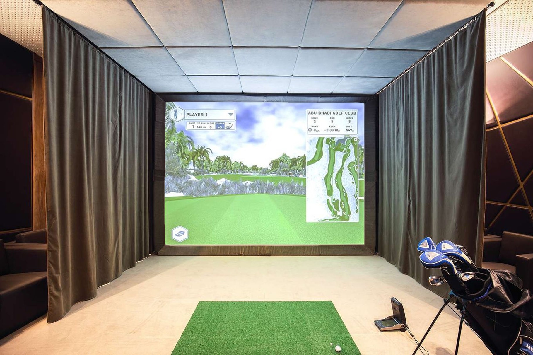 Ekskluzywna strefa golfowa, doskonale wpisująca się w charakter jednego z najbardziej prestiżowych budynków mieszkalnych w Europie. Już na pierwszy rzut oka przestrzeń przywodzi na myśl prywatne kino – z wygodnymi, tapicerowanymi fotelami, indywidualnymi stolikami oraz starannie zaprojektowanym wnętrzem, które daje przestrzeń graczom oraz wiernym obserwatorom rozgrywek.